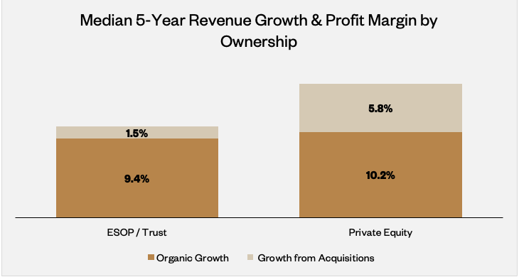 Profitability and revenue growth tell the same story. While AEES ESOPs generated median profit margins of 14.6% over the last five years, private-equity-owned AEES firms saw a notably higher margin at 18.0%, while also growing revenue at a faster rate over the same period.