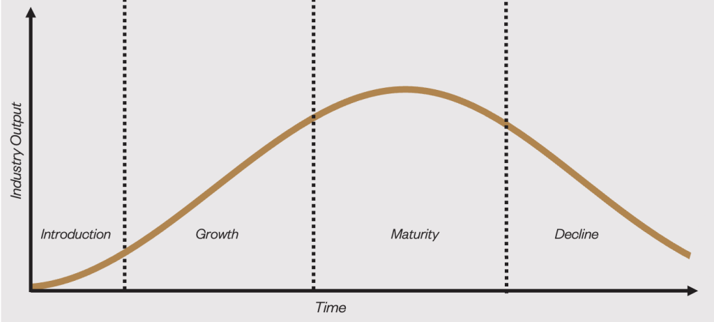 Most industries follow a common lifecycle that begins with introduction and then moves through growth, maturity, consolidation, and eventually decline. That textbook industry cycle typically relates to an industry’s ability to efficiently match output with demand. But beyond the output lifecycle, a business owner needs to be aware of where the industry sits in its valuation cycle, which is not the same thing.